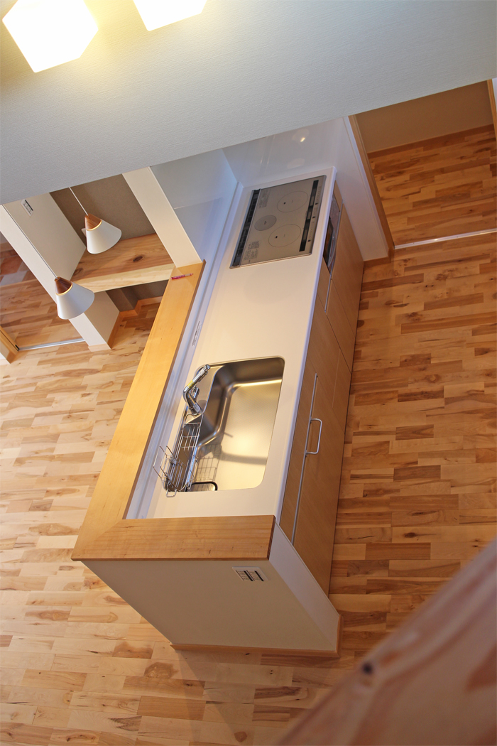 キッチン背面に横に広いタイプの窓を設置することで、キッチン全体が明るくなります。