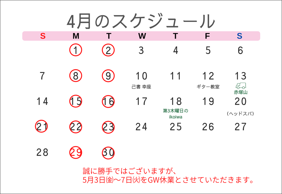 開催予定の教室等の内容です。お問合せ、ご予約はお気軽にどうぞ。